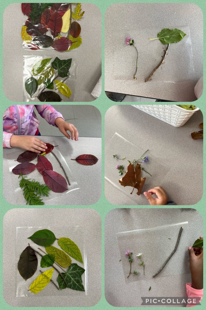 For this activity, have the children walk through nature, whether a scavenger hunt or an I Spy activity and collect things they find interesting from nature. Then, peel the laminate sheet into two pieces and allow the children to display their findings. Place the second laminate sheet on top, and you will be all set!