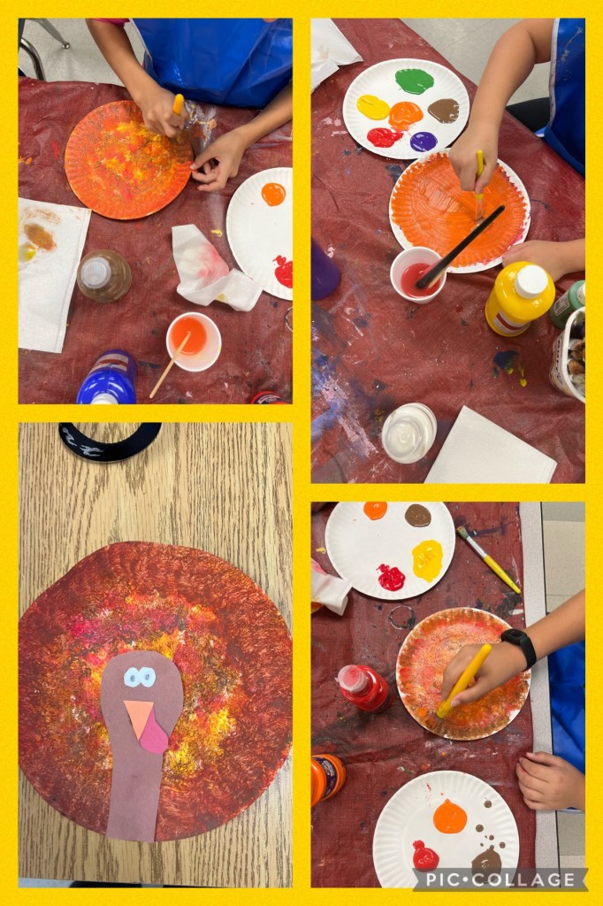 Have the children cut out their turkey head, eyes, and nose for this activity. Next, the children can paint the paper plates by dabbing the paint brushes to create the look of feathers. Once the plates are dry, glue them on the head, and it is complete.