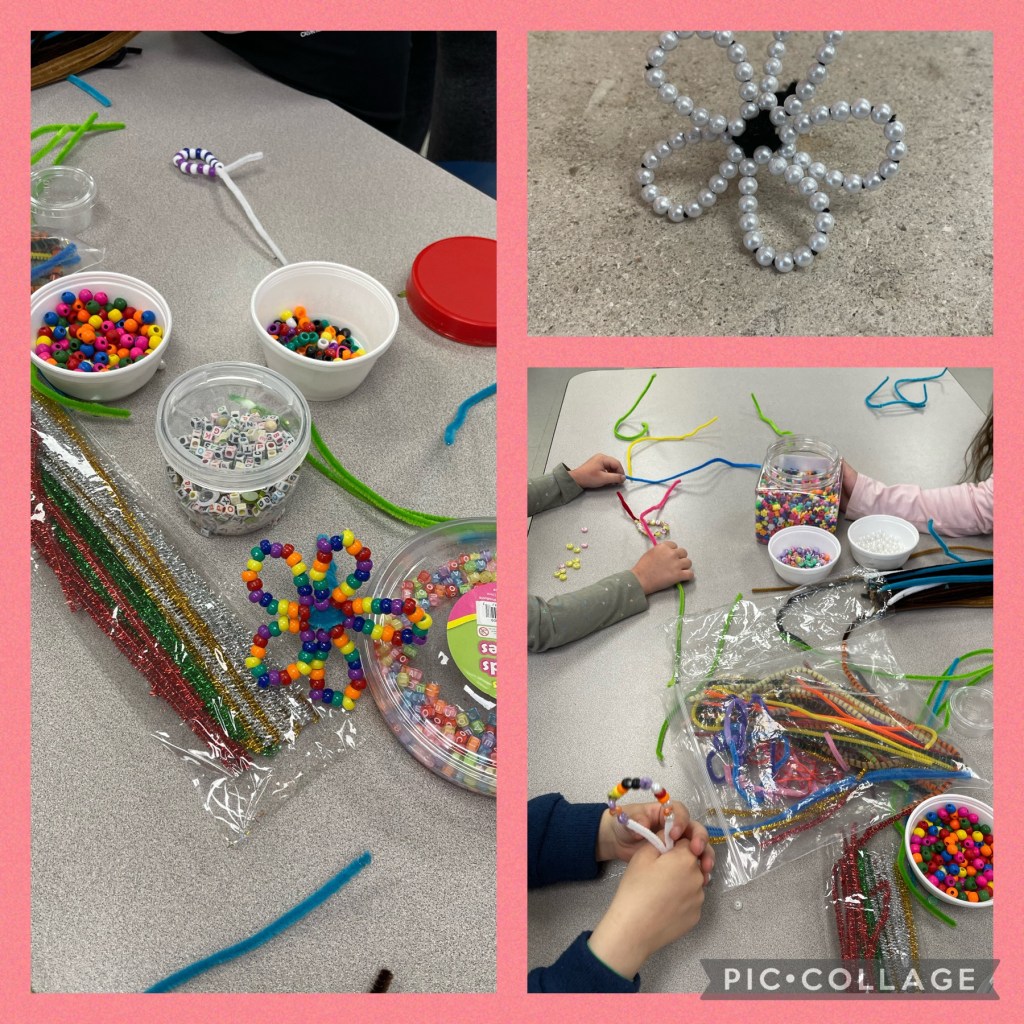 Add your beads onto a pipe cleaner and bend them into a loop for this activity. Do this for as many petals as you wish. In the end, you twist all the ends of the petals together to create a flower.
