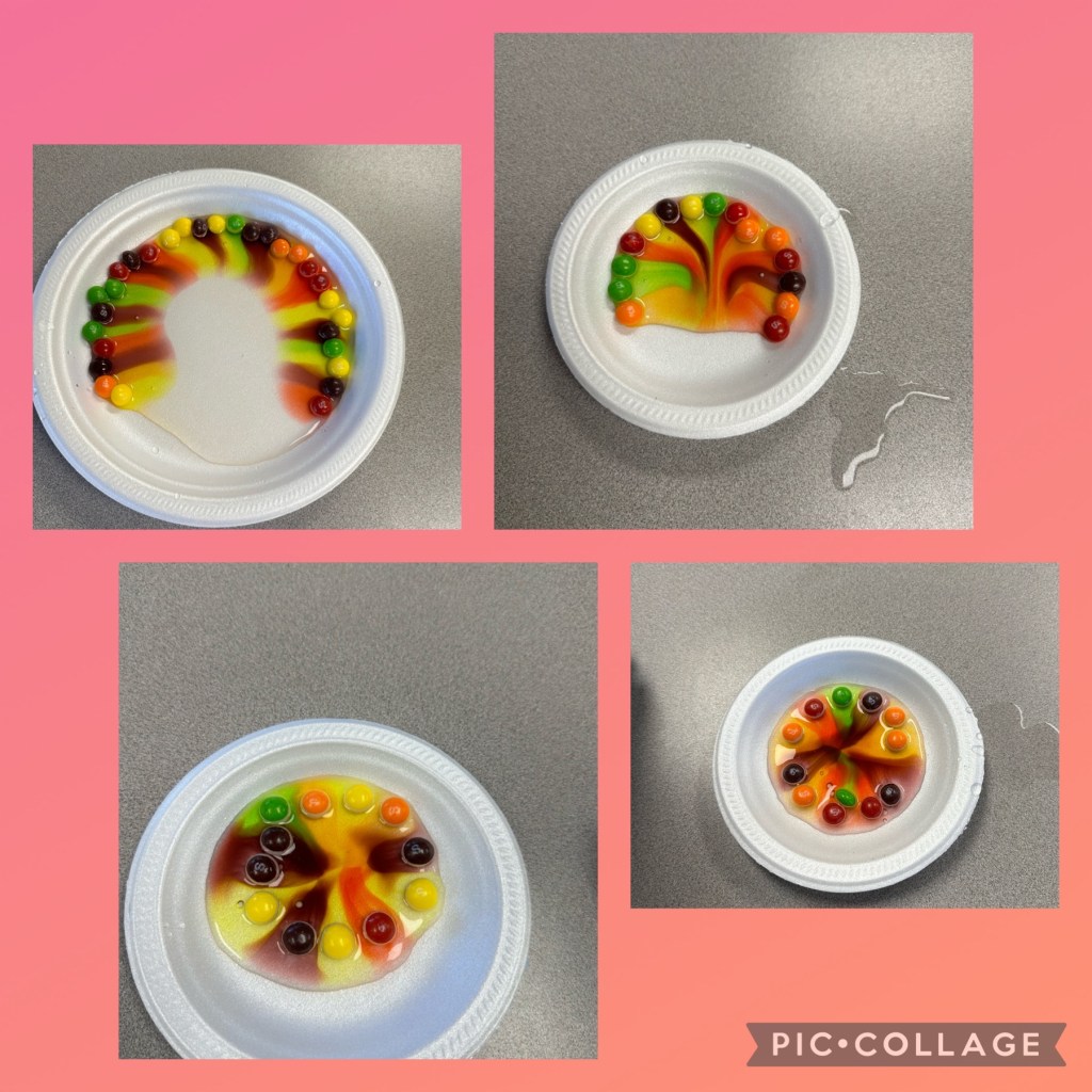 Place the skittles on a flat plate in any formation for this experiment. Pour warm water over the Skittles and watch the colours merge together.