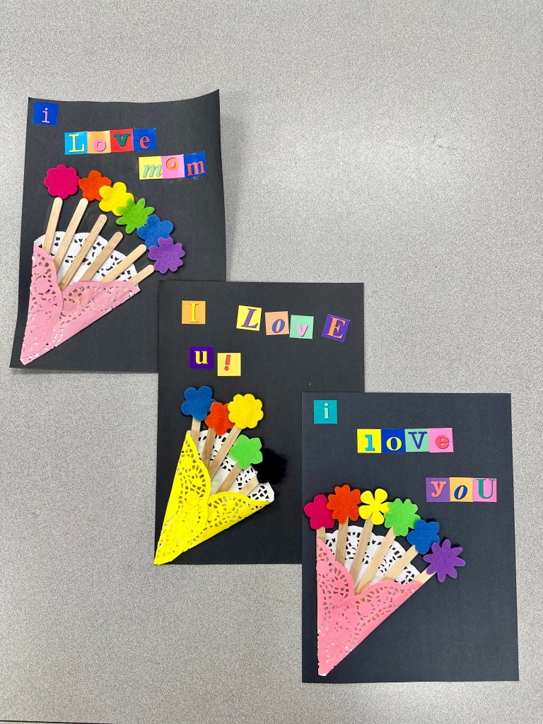 For this activity, the children will use coloured lace paper to create the wrapper around the bouquet. Then, add the popsicle sticks as the stems of the flowers, and using the foam flower cutouts, glue them on top of the popsicle sticks. Then, using the letter cutouts, the children can write a message!