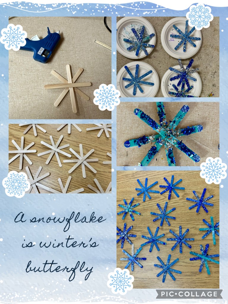 For this activity, I used the hot glue gun to glue together 4 popsicle sticks like a snowflake. Next, I gave the children paint and glitter to decorate their snowflakes. Allow snowflakes to dry, add string and then you can hang them around the class!